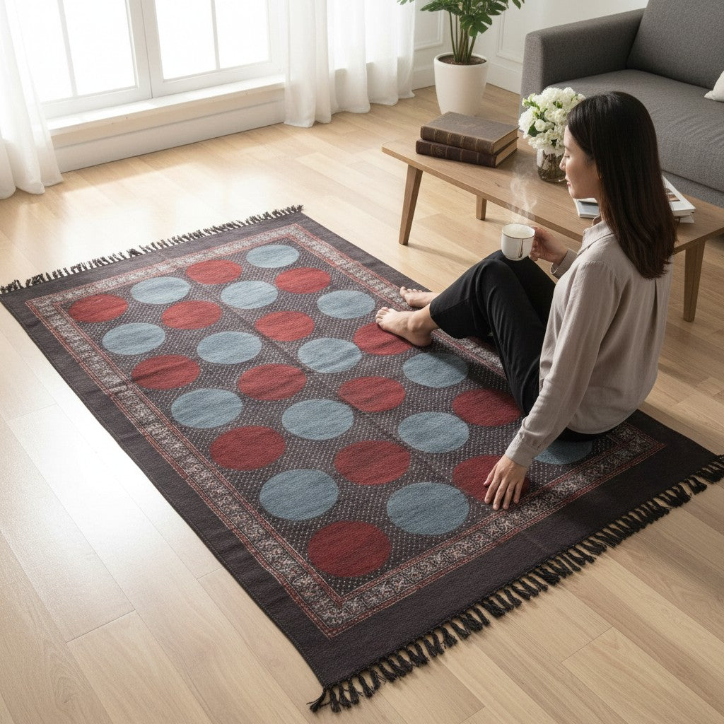 Polka Dot Red Ajrakh Block Printed Cotton Dhurrie