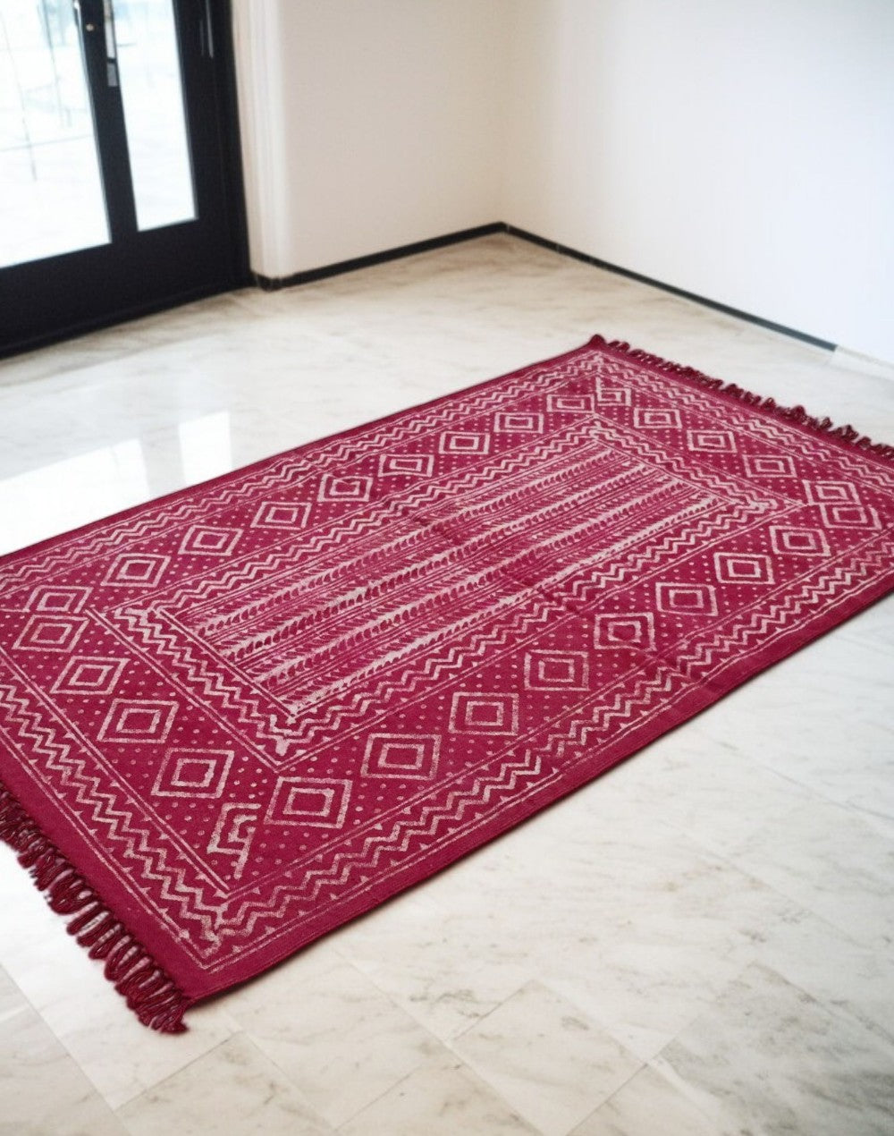 Red Ajrakh Cotton Woven Block Printed Dhurrie