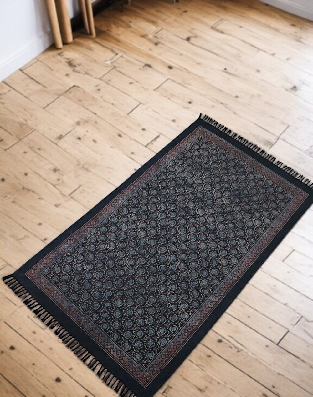 The charm of flat weave dhurries lies in simple stripe structure,symmetrical placement of motifs and geometrical forms. Cotton dhurrie woven in the weft faced plain weave tapestry technique. The flat weave dhurrie is sturdy due to the compactness of the weft.
