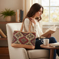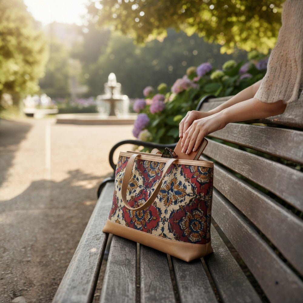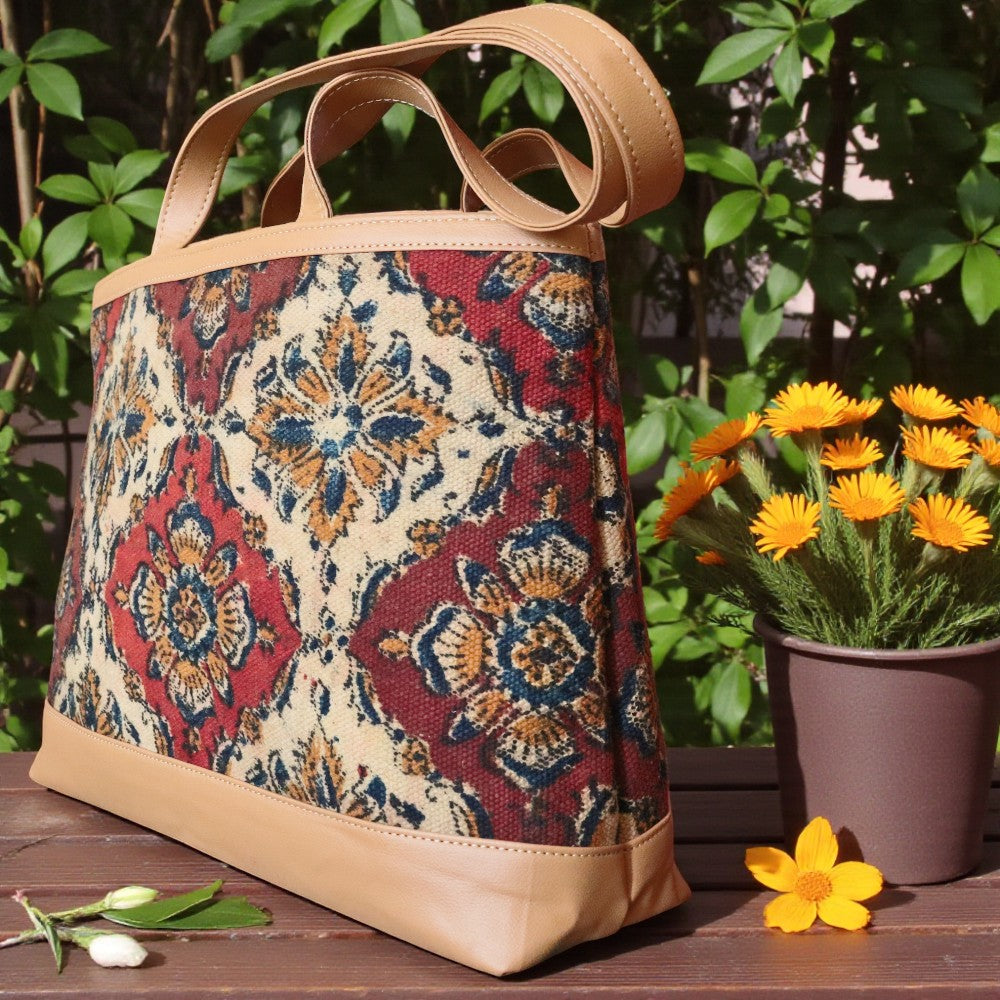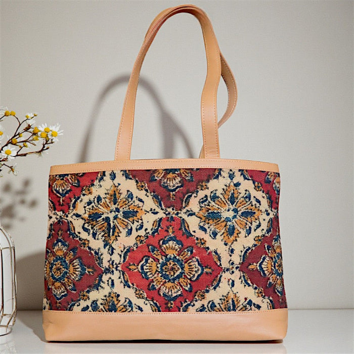 Originating in india, kalamkari is an ancient craft of hand painting or block printing textiles using vegetable colours. The word derived from the words Kalam, Meaning pen, kari , meaning workmanship. The very nature in which the printing and dying is crafted makes each Bag is unique.