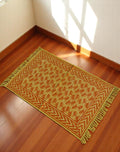 Artisans of Rajasthan make a mud-resist material using a mixture of desert sands called "Dabu”. This unique art is used to leave effects as mud-colored block prints on Dhurrie Made in Warangal by warangal Weavers. The base dhurrie will send to jaipur from warangal for Print.