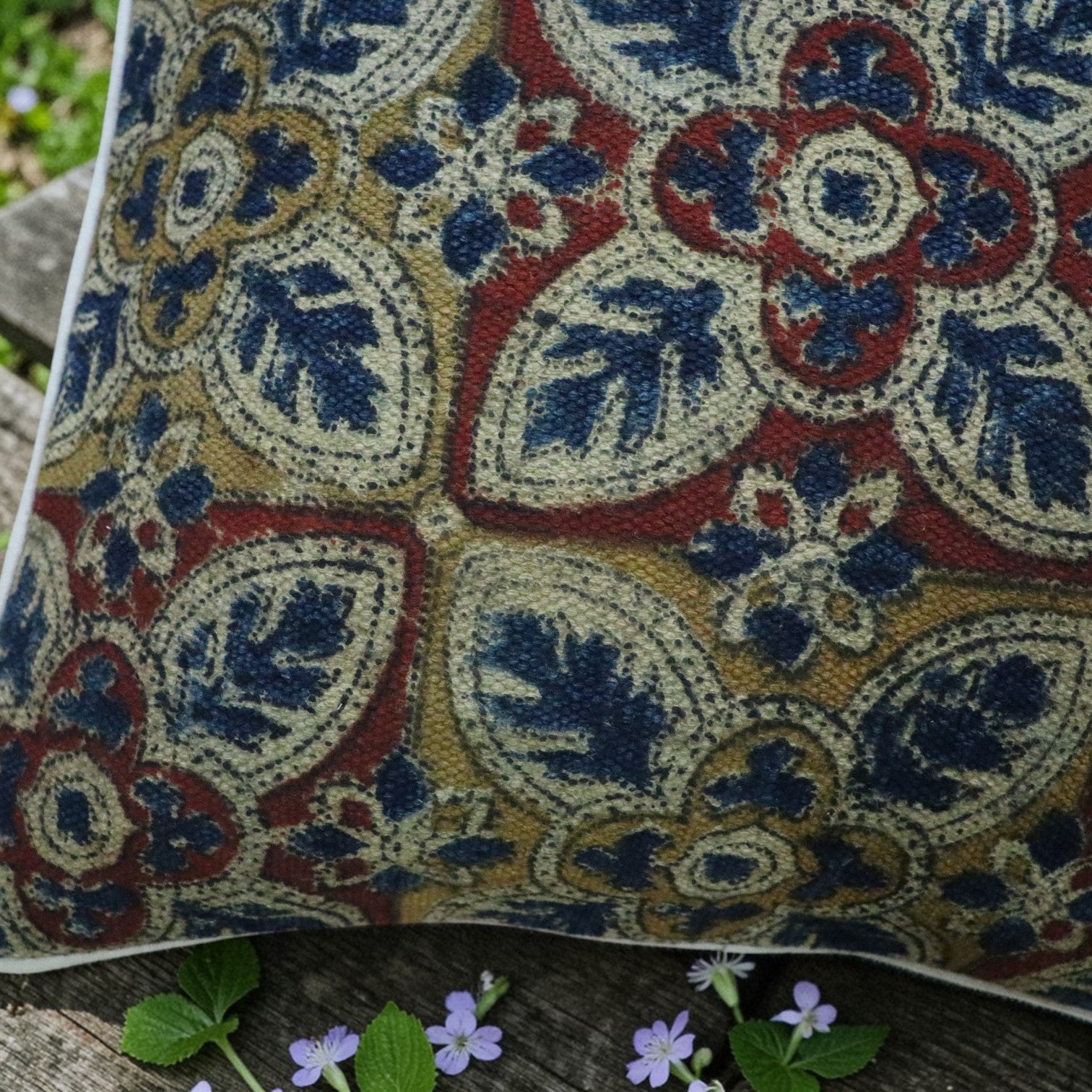 Originating in India, kalamkari is an ancient craft of hand painting or block printing textiles using vegetable colors. The word derived from the words Kalam, Meaning pen, kari , meaning workmanship. The very nature in which the printing and dying is crafted makes each piece is unique.