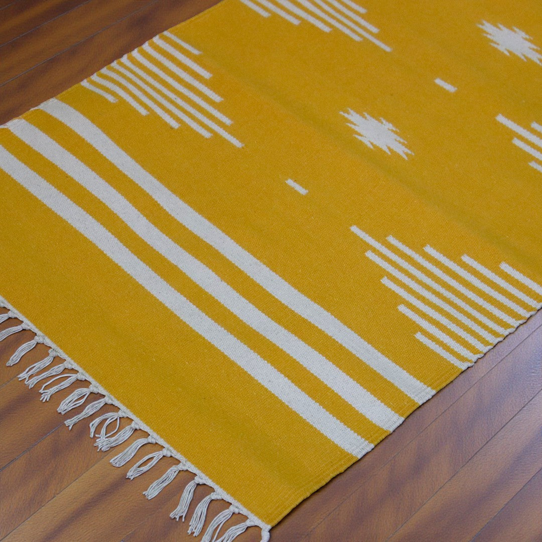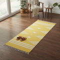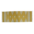 The charm of flat weave dhurries lies in simple stripe structure, symmetrical placement of motifs and geometrical forms. Cotton dhurrie woven in the weft faced plain weave tapestry technique. The flat weave dhurrie is sturdy due to the compactness of the weft.